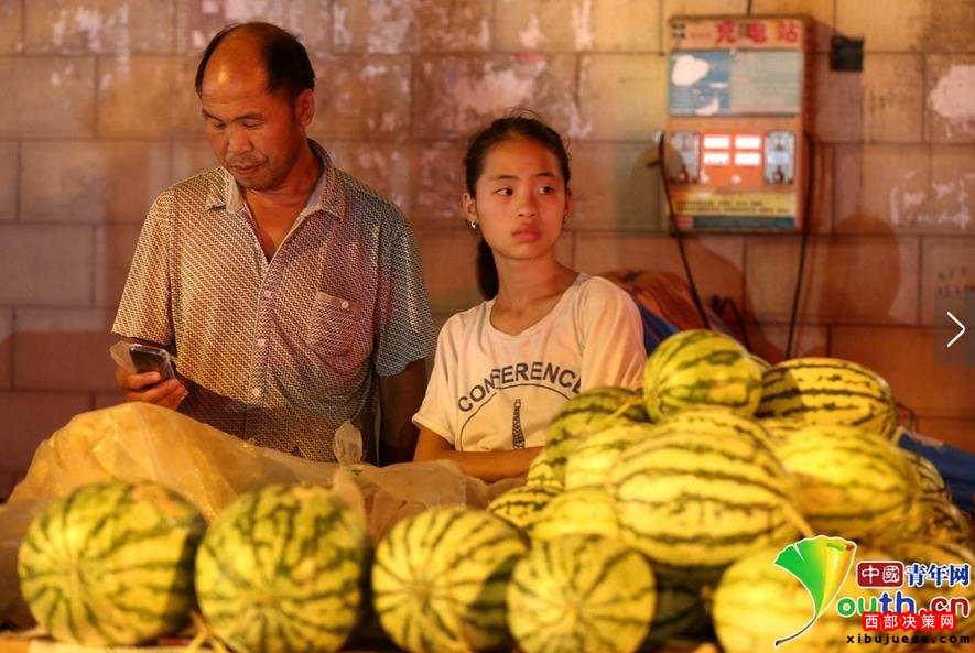 2016年7月10日夜晚,在河南省洛陽(yáng)市老城街頭,宜陽(yáng)縣高村鄉(xiāng)仟佰嶺村47歲的瓜農(nóng)石勛帶著12歲的女兒賣西瓜。“現(xiàn)在帶女兒賣瓜讓她體驗(yàn)一下瓜農(nóng)的艱辛是為了長(zhǎng)大女兒不再賣瓜,我家種了四畝西瓜,從家里到洛陽(yáng)開拖拉機(jī)要跑六個(gè)小時(shí),賣完西瓜回家趕,每天只能休息三個(gè)小時(shí),女兒去最遠(yuǎn)的地方就是洛陽(yáng)城,一車西瓜賣完給女兒20塊零花錢,女兒很開心”。石勛說(shuō)。