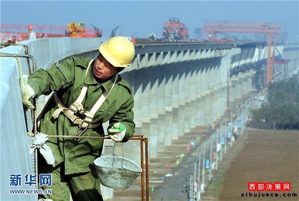 在京廣高鐵黃河大橋施工現(xiàn)場,一名工人在橋體上作業(yè)(2009年8月13日攝)。