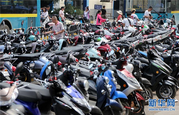 10月11日,市民在廣西南寧市街頭一個(gè)停車(chē)場(chǎng)存取電動(dòng)自行車(chē)。