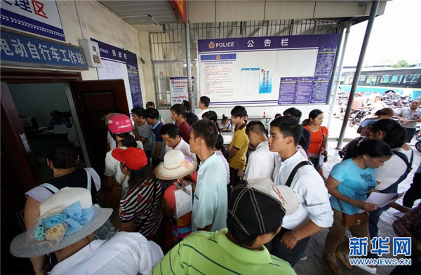 10月11日,市民在廣西南寧市獅山電動(dòng)自行車(chē)工作站排隊(duì)給自己的電動(dòng)自行車(chē)上牌。