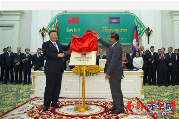 10月13日,國(guó)家主席習(xí)近平在金邊同柬埔寨首相洪森舉行會(huì)談。會(huì)談后,兩國(guó)領(lǐng)導(dǎo)人共同出席金邊中國(guó)文化中心揭牌儀式。