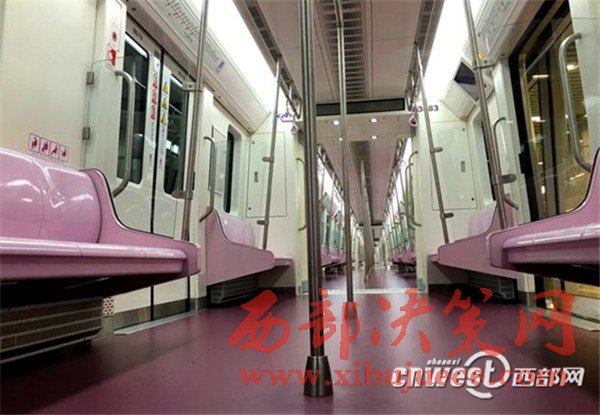 三號線電客車車廂,以粉紫色為基調,座椅、扶手、電客車地面都是“萌萌噠”的粉紫色,車廂里洋溢著濃濃的浪漫。