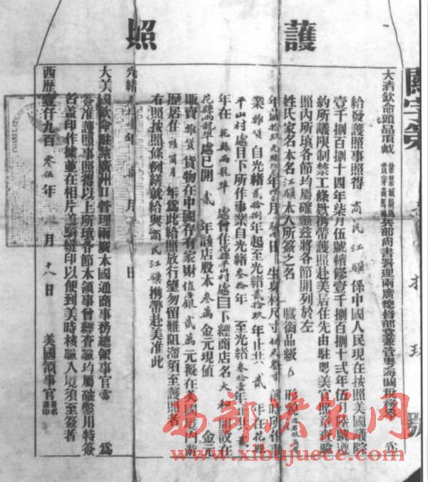 如此看來(lái),他是一位了不起的地方富商。江驥的太和商店主要經(jīng)營(yíng)雜貨貿(mào)易。因此,他向廣州政府申請(qǐng)去美國(guó)游歷,開(kāi)開(kāi)眼界。雖然1905年是美國(guó)百年排華運(yùn)動(dòng)的高潮年,而且美國(guó)政府明令禁止“華工”入境。就在江驥申請(qǐng)游美護(hù)照的前一個(gè)月,中國(guó)爆發(fā)了聲勢(shì)浩大的抵制美貨運(yùn)動(dòng),其目的就是抗議美國(guó)壓迫華僑。但是,美國(guó)是允許中國(guó)商人入境游歷的,像江驥這樣的廣州富商,更是歡迎。所以,兩廣總督岑春煊會(huì)同美國(guó)駐廣州總領(lǐng)事雷伏禮在1905年8月18日分別在江驥的中國(guó)護(hù)照了簽名,準(zhǔn)許其赴美游歷。