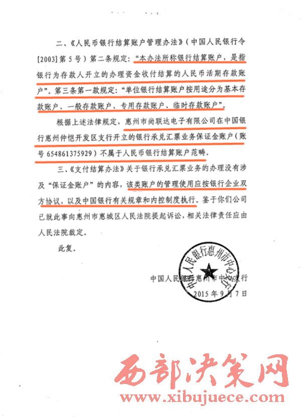 對此結果,谷奔公司并不滿意。李明告訴北京時間記者,本案的爭議焦點在于保證金賬戶的屬性上。“中行用非結算賬戶作結算使用就是違反國家的現(xiàn)行法律。人行惠州分行向法院出具的復函明顯態(tài)度曖昧,避重就輕,從而讓法官誤解而錯判,令人遺憾。”