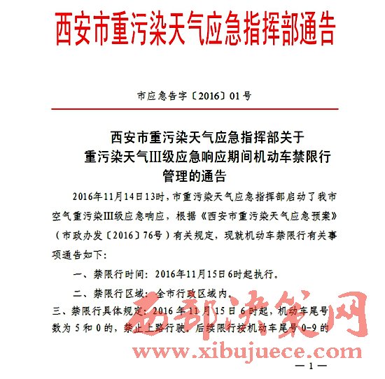 記者從西安市重污染天氣應(yīng)急指揮部了解到,2016年11月14日13時,西安市重污染天氣應(yīng)急指揮部啟動了西安市空氣重污染Ⅲ級應(yīng)急響應(yīng)。根據(jù)《西安市重污染天氣應(yīng)急預(yù)案》(市政辦發(fā)〔2016〕76號)有關(guān)規(guī)定,現(xiàn)就機動車禁限行有關(guān)事項通告如下: