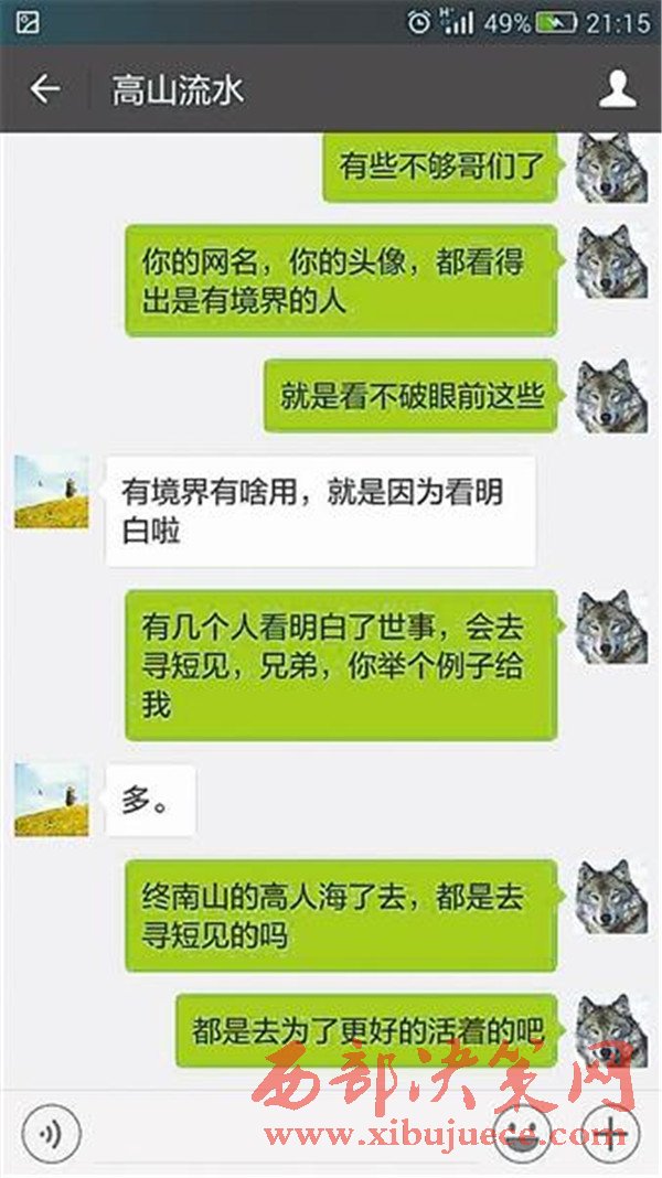 40歲的王先生居住在陜西,他與徐超原本并不相識。幾天前,王先生在貼吧發(fā)出一條交友的帖子,而后與網(wǎng)名為“他的眼淚在流淌”的徐超成為了微信好友。交流不久后,徐超突然表現(xiàn)出了輕生的念頭。在交流中,徐超接連表示“受苦太多想死”、“跳樓算了”……徐超說,自己“命不好”,事業(yè)和愛情都沒有,已經(jīng)“堅持不了了”。