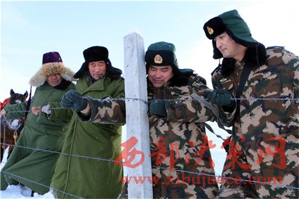 庫(kù)爾特邊防派出所官兵與護(hù)邊員修補(bǔ)損壞的鐵絲網(wǎng)。