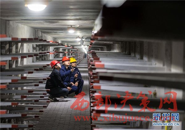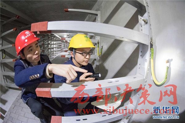 11月24日,解放碑地下環(huán)形電力隧道的一段支線電力隧道內(nèi),兩名國網(wǎng)重慶市區(qū)供電公司的技術(shù)人員(右一、右二)在對預(yù)留的商業(yè)用戶接入隧道的電力設(shè)施設(shè)備進行竣工驗收。當日,經(jīng)過3年多的緊張建設(shè),重慶地下環(huán)形“電力高速路”——解放碑地下環(huán)形電力隧道工程順利通過竣工驗收,并正式投入運行。解放碑環(huán)形電力隧道總長2408米,其中1198米的干線電力隧道已經(jīng)成功接入解放碑商圈及周邊地區(qū)的4個110千伏變電站形成環(huán)線,支線電力隧道1210米也開始陸續(xù)接入用戶。據(jù)介紹,作為重慶市重點工程,2013年7月開工建設(shè)的解放碑地下環(huán)形電力隧道按照滿足未來20年電力需求設(shè)計,隧道高2.8米、寬2.4米,投入運行后將解決重慶渝中半島和重慶最繁華的解放碑商業(yè)區(qū)配電設(shè)施老化、無法擴建等問題,使解放碑商圈供電負荷承載能力得到極大加強。