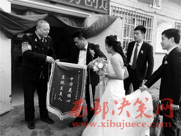12月4日上午,一輛婚車突然開進西安市辛家廟公交樞紐站,新郎白磊和新娘房佳歡將一面寫有“中華美德心至純至美人”字樣的錦旗,送到了211路司機李軍紅手中,這一新鮮場面頓時引起了眾人圍觀。
