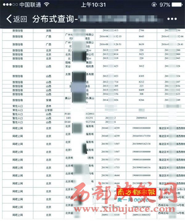12月8日,南都記者以了解親戚結(jié)婚對象為由,聯(lián)系上一家名叫“××商貿(mào)”的服務(wù)商,工作人員介紹,只需提供身份證號(hào)碼,即可查詢包括開房記錄、列車記錄、航班記錄、網(wǎng)吧記錄、出境記錄、入境記錄、犯罪記錄、住房記錄、租房記錄、銀行記錄、駕駛證記錄等11個(gè)項(xiàng)目在內(nèi)的材料,統(tǒng)稱“身份證大軌跡”。