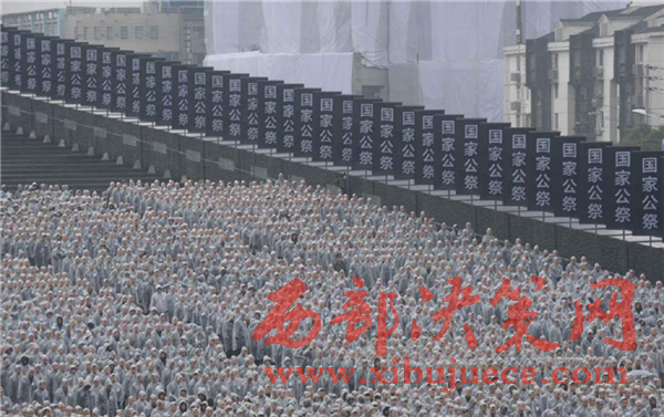 十時整,公祭儀式正式開始。雄壯的《義勇軍進(jìn)行曲》在廣場上響起,全場高唱中華人民共和國國歌。