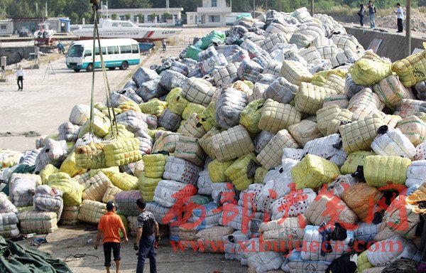 深圳海關查獲銷毀千余噸走私的舊衣物,圖為堆放在碼頭的舊衣物