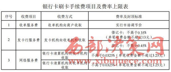 【政策】國家發(fā)改委、中國人民銀行今年3月份聯(lián)合印發(fā)《關于完善銀行卡刷卡手續(xù)費定價機制的通知》,自9月6日起總體上較大幅度降低收費水平。發(fā)卡機構收取的發(fā)卡行服務費將對借記卡、貸記卡差別計費。借記卡費率降低為不超過交易金額的0.35%,單筆收費13元封頂。