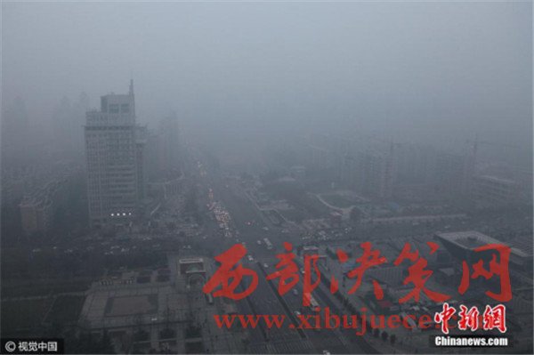 2016年12月19日,鳥瞰西安城市,霧霾籠罩,不太遠(yuǎn)的建筑也幾乎被霧霾“吞噬”,看不到一點(diǎn)影,當(dāng)日早八點(diǎn),空氣質(zhì)量指數(shù)達(dá)409,為嚴(yán)重污染。 圖片來源:視覺中國