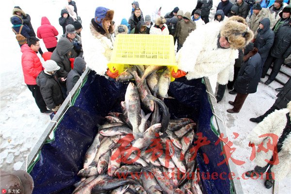 2016年12月25日,哈爾濱市長嶺湖舉行第三屆冬捕冬釣旅游節(jié)?,F(xiàn)場,漁民鑿開冰封的湖面,首網(wǎng)撈起萬余斤鮮魚,吸引了許多市民和游客前來觀看。冰面上支起大鍋,現(xiàn)場熬制鮮魚湯供人們品嘗。