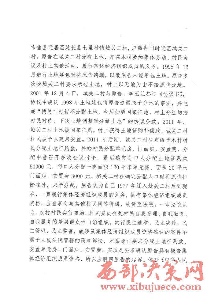 西部決策網(wǎng)訊(記者 封營庫 實(shí)習(xí)記者 李延梅)陜西延長縣七里村村民李果花反映稱:“1977年我從榆林市佳縣遷居至延長縣七里村鎮(zhèn)城關(guān)二村,戶籍也同時(shí)遷至城關(guān)二村。我在城關(guān)二村分有土地,并在本村參加集體勞動(dòng)村民會(huì)議及村上其它活動(dòng),履行集體經(jīng)濟(jì)組織成員的義務(wù)。1998年12月進(jìn)行土地延包時(shí)將我遺漏,以致我未能承包土地。我多次找城關(guān)二村要求承包土地,村上以無地為由不給我分地。2001年12月4日,城關(guān)二村與我、李玉蘭簽訂《協(xié)議書》,協(xié)議中確認(rèn)1998年土地延包時(shí)將我遺漏未有分地的事實(shí),并達(dá)成“城關(guān)二村暫不分配土地,今后如遇國家征地,村上分紅均按村民對待,下次土地調(diào)整時(shí)分給土地”的協(xié)議條款。2011年,城關(guān)二村土地被國家征購,村上獲得土地征購補(bǔ)償款,城關(guān)二村村民被予以建安置房。2011年后期,城關(guān)二村決定給予本村村民分配土地征購款,并給村民分配單元房、門面房、安置費(fèi),分配中曾召開多次會(huì)議討論,最后確定每口人分配土地征購款50000元,每口人分配一套面積120平米單元房,面積20平米的門面房,安置費(fèi)5000元,城關(guān)二村在確定人口時(shí)將我排除在外,未予分配。我認(rèn)為自己1977年遷入城關(guān)二村后到現(xiàn)在,一直履行集體經(jīng)濟(jì)組織成員的義務(wù),擁有集體經(jīng)濟(jì)組織成員資格,應(yīng)當(dāng)享有與其他村民同等待遇,故訴至延長縣人民法院要求判令城關(guān)二村給予我分配土地征購款50000元,安置單元房一套(120平米)、門面房20平米,安置過渡費(fèi)5400元。但被延長縣人民法院以涉及集體經(jīng)濟(jì)組織成員資格的案件不屬于人民法院管轄的民事訴訟,駁回起訴。我又上訴至延安市中級人民法院,但又用同樣的理由又被駁回上訴。我該怎么辦?真的天下烏鴉一般黑嗎?我訴訟的是要回屬于我的征地款、安置房、過渡費(fèi),我有合法的戶口簿、身份證。又有延長縣城關(guān)鎮(zhèn)政府副鎮(zhèn)長張世杰、包村片長趙華強(qiáng)、包村干部白醫(yī)學(xué)、城關(guān)村村主任(二村村民)董志軍、二村村長趙金星,原二村會(huì)計(jì)王連平,原二村代表老村長丁興元,在鎮(zhèn)政府會(huì)議室簽訂的協(xié)議書。難道我的村民資格還要確認(rèn)嗎?我村村長董志軍的兒子董飛戶口也不在我村,又是公務(wù)員,現(xiàn)任延長縣紀(jì)律檢查委員會(huì)案件審理室主任,還有村長董志軍他父親。董長春早已去世,但也同樣分的征地補(bǔ)償款,安置單元房,安置過渡費(fèi)。望你們新聞媒體深入調(diào)查,將事實(shí)公布于眾,為我申冤,維護(hù)我的合法權(quán)益。”