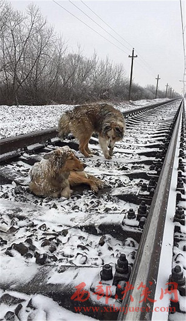 在嚴(yán)寒中,兩只狗狗在鐵軌上蜷縮了兩天,一動(dòng)不動(dòng)。Lucy受傷嚴(yán)重,沒(méi)法從鐵軌上挪動(dòng)下來(lái)。Panda一直在她身邊保護(hù)她,用自己的身體為她保溫,當(dāng)有火車(chē)逼近時(shí),Panda想盡辦法把Lucy的頭按下,讓火車(chē)可以在它們頭頂經(jīng)過(guò)。