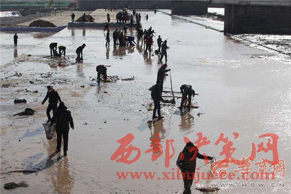 12月27日上午,咸陽(yáng)湖放水剛結(jié)束,渭城橋下瞬間就變成了漁場(chǎng),數(shù)百人在橡膠壩附近撿魚捕魚,有人甚至不顧危險(xiǎn)跑到淤泥里去撈魚。咸陽(yáng)湖管理處工作人員提醒,湖底淤泥情況不明,市民切勿涉險(xiǎn)下湖撈魚,以免發(fā)生不測(cè)。