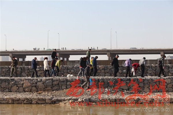 咸陽(yáng)湖橡膠壩附近,滿是捕魚和撈魚的人。