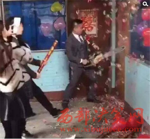 伴娘擋在門前,向新郎要紅包,一定要數(shù)目夠大才肯開(kāi)門?,F(xiàn)場(chǎng)的伴郎團(tuán)把伴娘拉下去,新郎撿起了地上的一把電鋸,這是要干什么呢?