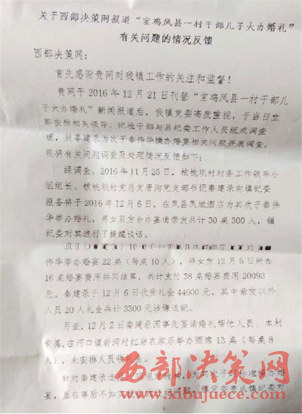 西部決策網(wǎng)訊(任書彥) 本網(wǎng)2016年12月21日刊文《寶雞鳳縣一村干部兒子大辦婚禮》報(bào)道鳳縣河口鎮(zhèn)唐溝村支部書記秦建錄直接挑戰(zhàn)中央八項(xiàng)規(guī)定,為兒子大辦婚禮。經(jīng)寶雞市紀(jì)委批示鳳縣紀(jì)委從嚴(yán)查處。