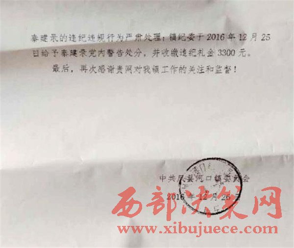 2016年12月27日鳳縣河口鎮(zhèn)人民政府回饋:經(jīng)鳳縣河口鎮(zhèn)紀(jì)委查處,對涉事人鳳縣河口鎮(zhèn)唐溝村支部書記秦建錄黨內(nèi)警告處分,并收繳違紀(jì)禮金3300元。