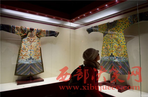 2017年01月05日,遼寧省沈陽市,沈陽故宮博物院舉行“錦繡華彩—院藏清宮織繡展”,清朝皇帝冬季朝袍首次亮相。沈陽故宮是中國(guó)僅存的兩大古代皇家宮殿建筑群之一,為清朝初期努爾哈赤和皇太極的宮殿,距今近400年歷史,貯藏近20萬件清宮御用物品和內(nèi)府秘籍。清明黃江綢繡金龍出鋒夾朝袍。
