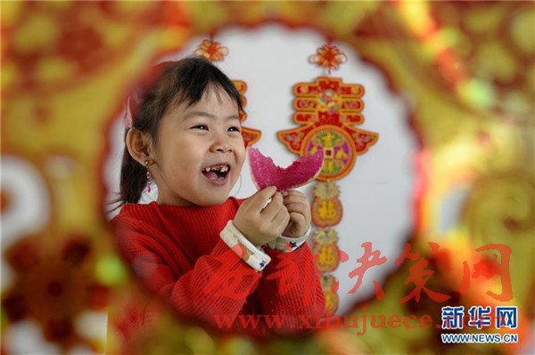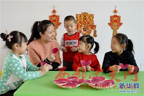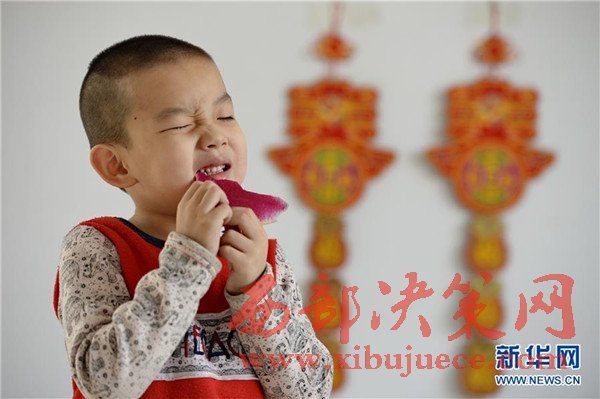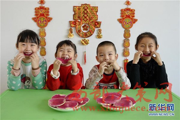 2月3日,河北省邢臺(tái)市橋東區(qū)三義廟社區(qū)的兒童在社區(qū)兒童娛樂(lè)室吃蘿卜“咬春”。