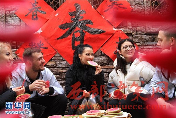2月3日,在山東省臨沂市沂南縣竹泉村,來(lái)自俄羅斯的游客瑪麗婭(中)與同伴在開(kāi)辦農(nóng)家樂(lè)的村民肖蕊(右二)家中吃生蘿卜,體驗(yàn)“咬春”。