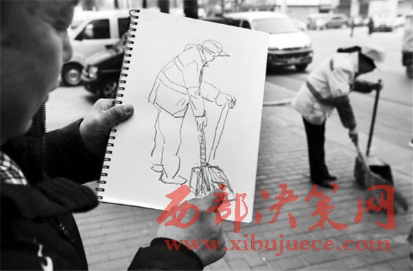 昨天下午,記者見到李福昌,他拿起素描本和記者一起出了門,家門口永新路上,一名保潔員打開道沿邊的垃圾桶,拎出內(nèi)膽,將垃圾倒進清運車。李福昌靜靜站在10米開外的地方,打開本子拿起筆,寥寥幾筆就將一位正在掃地的保潔員生動形象地勾勒出來。他沒有上前打擾保潔員,保潔員也沒有發(fā)現(xiàn)他。隨后,他又來到大興路、西二環(huán),保潔員忙碌的身影都被他一一收入畫中。