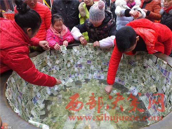 2017年2月,正月迎財神、拜財神。在湖北宜昌當(dāng)陽玉泉寺,眾多香客向玉泉寺內(nèi)的巨型銅缸里投幣、在銅缸壁上貼幣祈福。