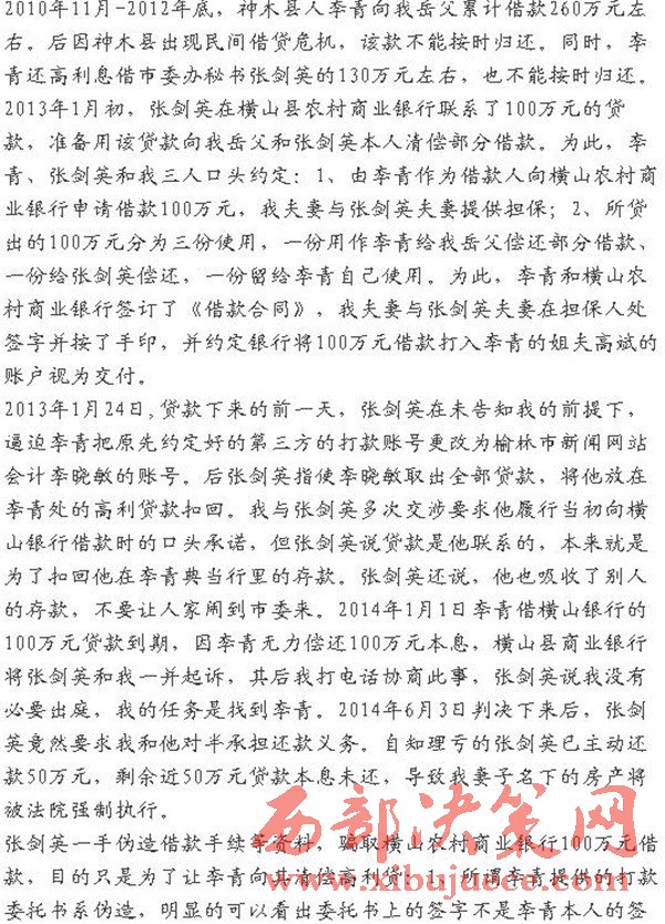 網(wǎng)友微信公眾號(hào) 江嶼濯浪爆料 2010年11月-2012年底,神木縣人李青向我岳父累計(jì)借款260萬元左右。后因神木縣出現(xiàn)民間借貸危機(jī),該款不能按時(shí)歸還。同時(shí),李青還高利息借市委辦秘書張劍英的130萬元左右,也不能按時(shí)歸還。2013年1月初,張劍英在橫山縣農(nóng)村商業(yè)銀行聯(lián)系了100萬元的貸款,準(zhǔn)備用該貸款向我岳父和張劍英本人清償部分借款。為此,李青、張劍英和我三人口頭約定:1、由李青作為借款人向橫山農(nóng)村商業(yè)銀行申請借款100萬元,我夫妻與張劍英夫妻提供擔(dān)保;2、所貸出的100萬元分為三份使用,一份用作李青給我岳父償還部分借款、一份給張劍英償還,一份留給李青自己使用。為此,李青和橫山農(nóng)村商業(yè)銀行簽訂了《借款合同》,我夫妻與張劍英夫妻在擔(dān)保人處簽字并按了手印,并約定銀行將100萬元借款打入李青的姐夫高斌的賬戶視為交付。