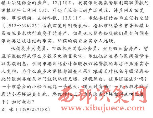 直到2015年的12月2日,橫山法院的羅某某用(0912-7660873)打電話給我說,榆林市紀(jì)委通知法院,要繼續(xù)執(zhí)行我妻子在榆林被橫山法院保全的房產(chǎn)。12月10日,我將張劍英集資取利騙取貸款的舉報(bào)材料上傳網(wǎng)上后,引起了社會(huì)上的廣泛關(guān)注,許多網(wǎng)友回復(fù)稱,事實(shí)明朗,支持舉報(bào)。12月11日,市紀(jì)委信訪辦李主任打電話(0912-3596926)給我回復(fù)時(shí)明確表示,榆林市紀(jì)委未曾告知橫山縣法院要求執(zhí)行我妻子的房產(chǎn),但是也未曾告知我他們是如何調(diào)查張劍英違規(guī)違紀(jì)的事實(shí),所謂的調(diào)查著實(shí)令人起疑。