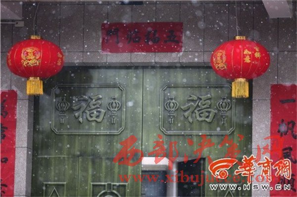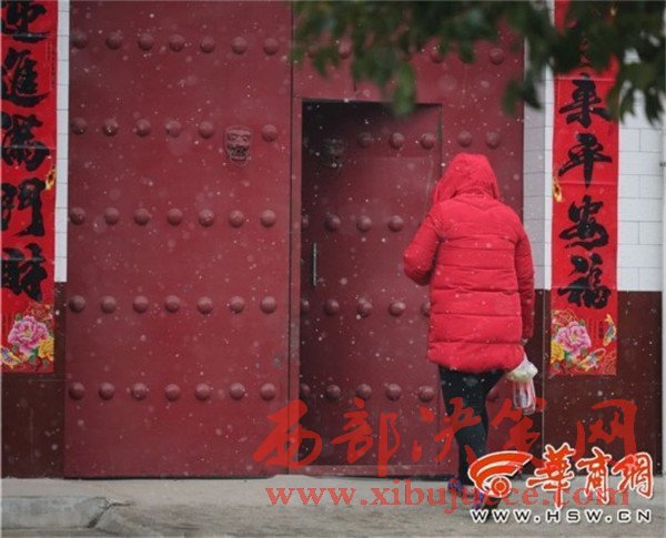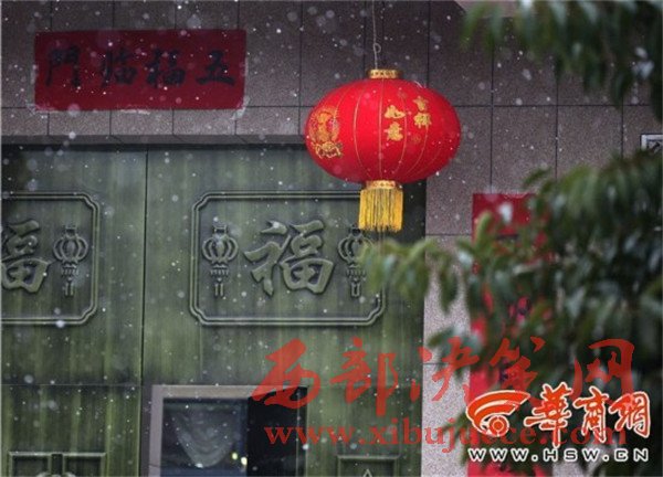 在高陵區(qū)一家農(nóng)戶門口,瑞雪與燈籠、對(duì)聯(lián)相應(yīng),也有了過年的氣氛。