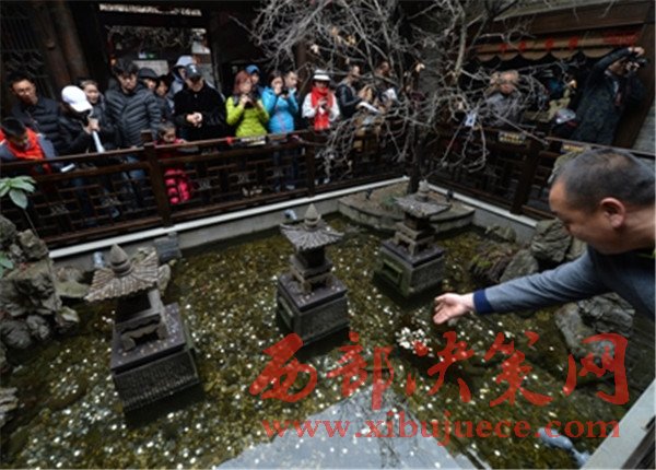 中午時(shí)分,記者又一次仔細(xì)觀察了水池,在游人拋投硬幣時(shí),確實(shí)有一兩條金色的觀賞魚在石縫處游動著。在木制欄桿四周,正貼著“禁止倚靠欄桿”、“禁止投幣”等字樣。“春節(jié)游客爆滿,水池是從寬巷子到窄巷子的必經(jīng)之道,加上很多人在拋硬幣,頓時(shí)人滿為患。我們只好打印了幾張?zhí)嵝褟堎N起來。”辦公室工作人員還表示,“等春節(jié)游客潮稍微退卻,天氣回暖,我們就要派人下水打撈這些硬幣,用于景點(diǎn)建設(shè)。”