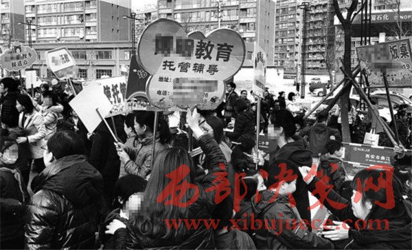 12時(shí),曲江二小門(mén)口,有很多托管班的工作人員舉著牌子,記者粗略數(shù)了一下,牌子有30多個(gè)。