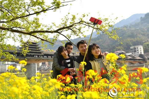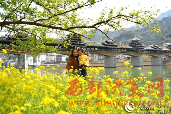 春暖花開時(shí)節(jié),廣西龍勝各族自治縣民族風(fēng)雨橋旁的油菜花競(jìng)相綻放,風(fēng)雨橋在油菜花的點(diǎn)綴下美不勝收,形成了一道美麗的春天景致,充滿著濃郁的春天氣息,吸引眾多游客前來觀賞拍照。