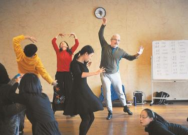 茲維卡(右)指導(dǎo)學(xué)員伴隨著音樂(lè)的節(jié)拍進(jìn)行舞動(dòng)。