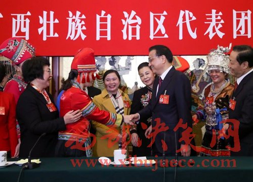 【李克強(qiáng)在廣西團(tuán)巧借“劉三姐”祝福全國(guó)女同胞】三八婦女節(jié)這天,李克強(qiáng)來(lái)到廣西代表團(tuán)參加審議報(bào)告。他首先祝在場(chǎng)的女代表及女同胞節(jié)日快樂??偫碚f:“廣西是劉三姐的家鄉(xiāng),她的歌聲至今余音繚繞,代表了女同胞美好的形象。我在這里向你們,并通過你們向全國(guó)女同胞致以節(jié)日的問候和衷心的祝福。”