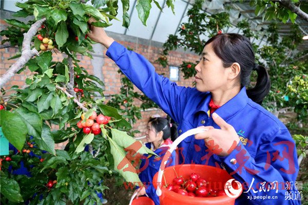 3月8日,在新疆生產(chǎn)建設(shè)兵團第八師一三四團華蓉櫻桃園里,紅紅的櫻桃掛滿枝頭,員工們正在采收成熟的櫻桃。