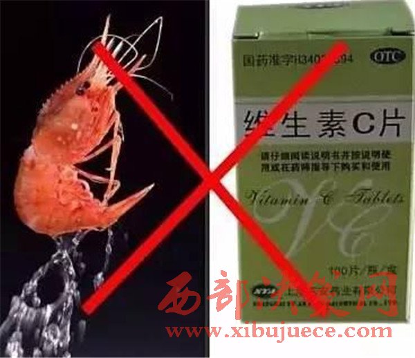 蝦+富含維生素C的食物生成砒霜,有劇毒。