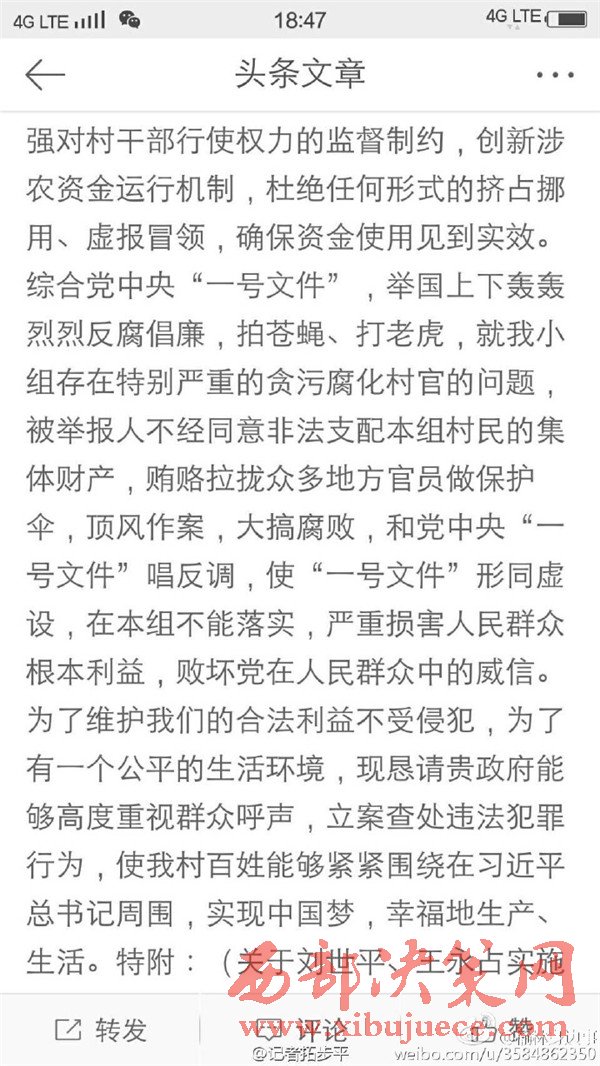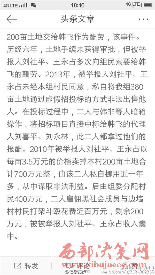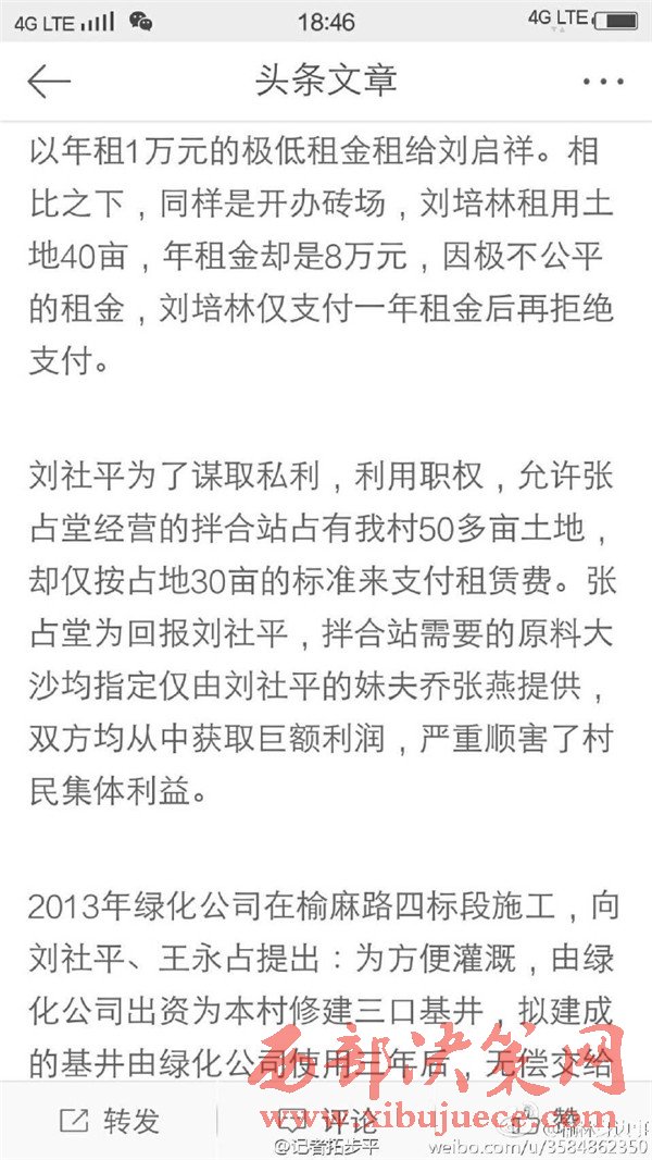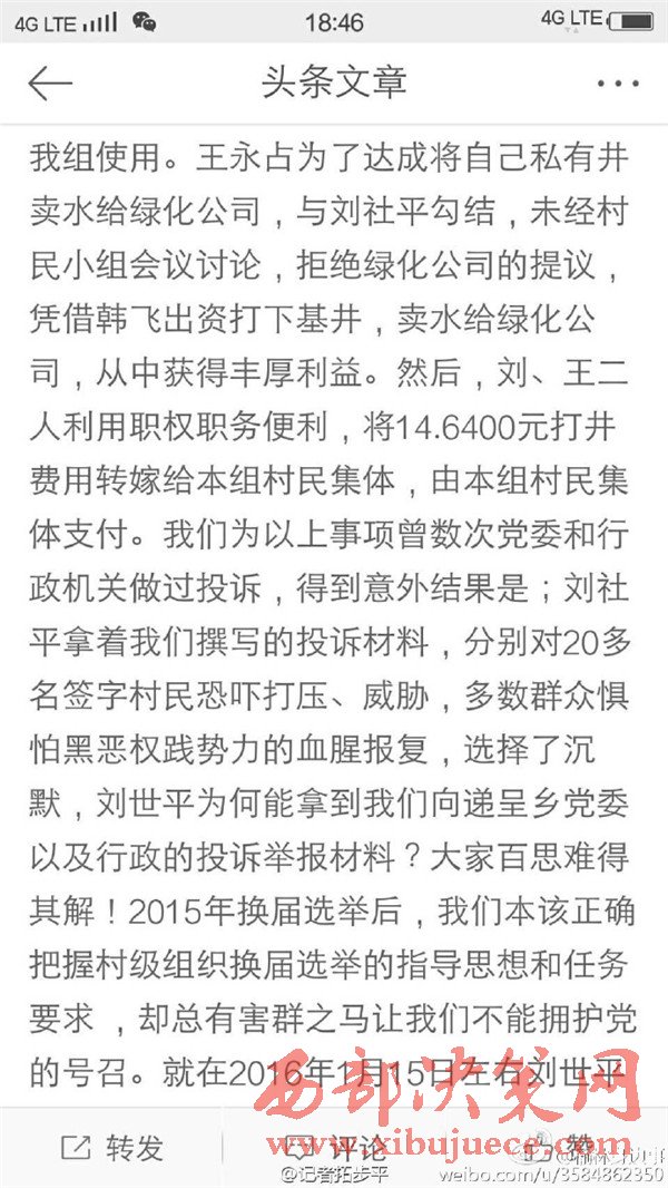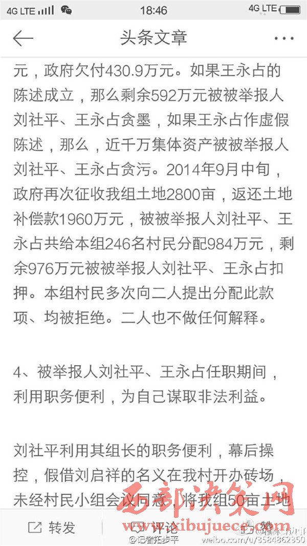 近日有微博網(wǎng)友飆新聞微博爆料:自被舉報(bào)人劉社平、王永占二人任職以來(lái),一手把持組委,視組委為自家私有權(quán)力,從來(lái)不向組民公布賬務(wù)。他們不但不為組民謀利,反而利用職務(wù)便利將村民集體數(shù)千萬(wàn)財(cái)產(chǎn)據(jù)為己有。請(qǐng)相關(guān)部門調(diào)查回復(fù)!