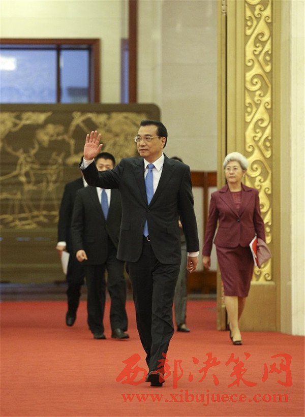 李克強(qiáng)步入人民大會(huì)堂三樓金色大廳會(huì)見中外記者