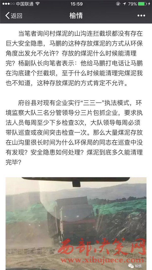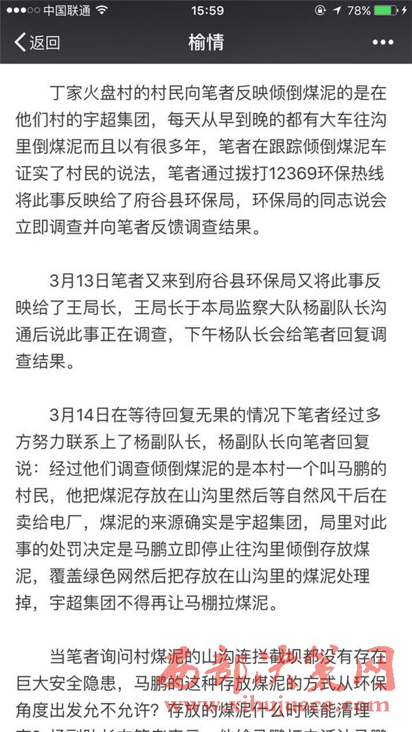3月13日筆者又來到府谷縣環(huán)保局又將此事反映給了王局長,王局長于本局監(jiān)察大隊(duì)楊副隊(duì)長溝通后說此事正在調(diào)查,下午楊隊(duì)長會(huì)給筆者回復(fù)調(diào)查結(jié)果。