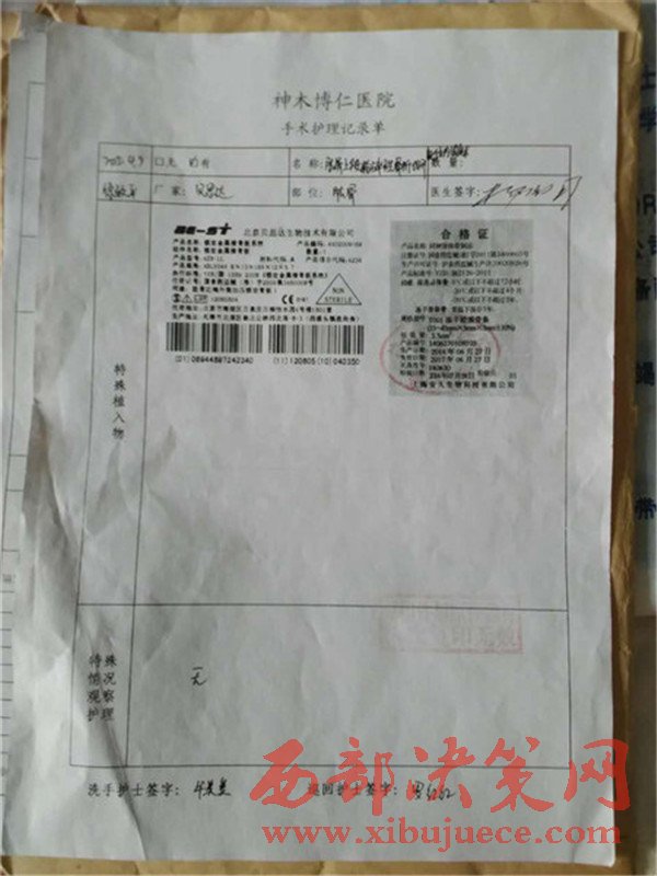 患者家屬將原來在博仁醫(yī)院住院的資料全部拿出來時發(fā)現(xiàn),大保當博仁醫(yī)院當時給患者做手術所用的鋼板可能存在問題,做手術所用的鋼板與當時給患者提供的合格證書不符,在此期間家屬也找過原博仁醫(yī)院劉院長,所給的答復是他剛來不知道此事,董事長(賀玉剛)也說是在西安,你們先看病,回頭把鋼板拿過來,等鋼板廠家的人來了,我們?nèi)阶谝黄鹂丛趺唇鉀Q,就這樣一直拖著直到現(xiàn)在。