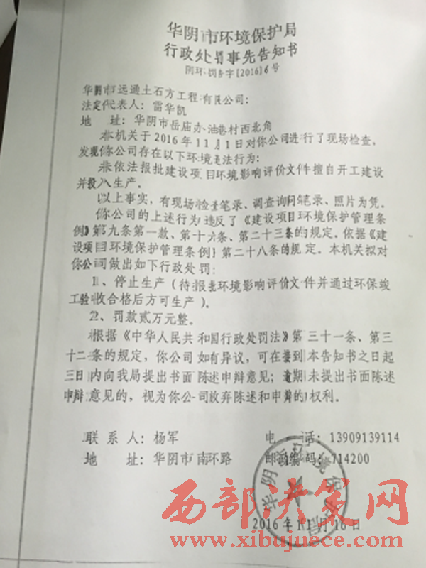一份2016年11月23日《華陰市環(huán)境保護局行政處罰決定書》復印件顯示,環(huán)保局于2016年11月1日對該公司進行了現場檢查,發(fā)現該公司存在未依法報批建設項目環(huán)境影響評價文件擅自開工建設并投入生產。處罰是停止生產和罰款2萬元。