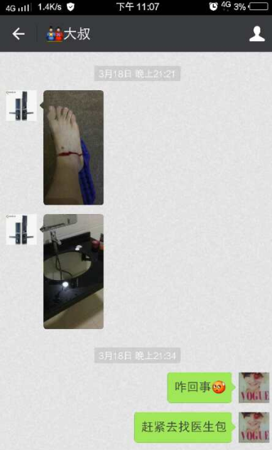 隨后,馬女士給本刊人員發(fā)來了她與老公的微信對(duì)話截圖和老公給她發(fā)來腳受傷的照片。通過微信截圖和照片顯示死者是在3月18日晚上21時(shí)21分受的傷,同衛(wèi)計(jì)局所說當(dāng)晚9時(shí)40多不到十點(diǎn)鐘的時(shí)間是相吻合的,但令人意想不到的是一個(gè)外傷竟然不到半小時(shí)就奪走了秦先生的性命。