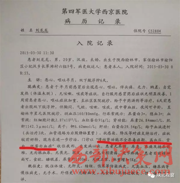 2015年3月我小兒子劉龍龍由感冒引發(fā)急性尿毒癥第五期,從此我們一家過上了人間少有的被恐懼包圍的日子。時(shí)至今日我們輾轉(zhuǎn)榆林星元醫(yī)院、西安西京醫(yī)院、西安交大附屬醫(yī)院等大醫(yī)院治療,前后做了8次血漿置換腹膜透析手術(shù)。每天透析3、4次,每一個(gè)月病人住院花費(fèi)四、五萬元。2年時(shí)間花費(fèi)110多萬元,現(xiàn)在就靠透析維持生命。因此醫(yī)生對(duì)我說,我兒子做透析不是長(zhǎng)久之計(jì),唯