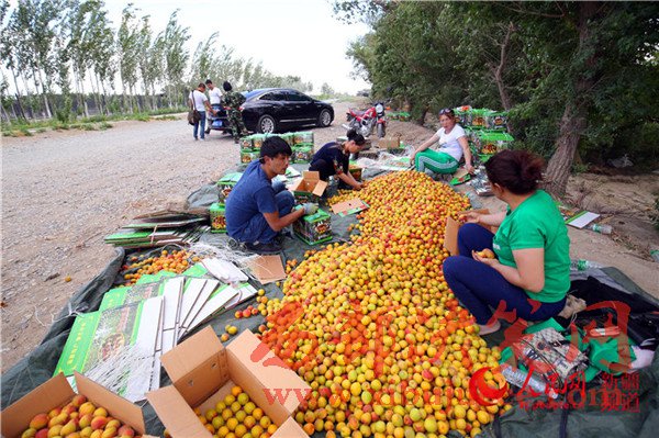 走進(jìn)周振峰的杏院子,紅彤彤的杏子已經(jīng)壓彎了枝頭,大家正在緊張采摘。在杏園外,從烏魯木齊來的客商買買提·吐爾遜也和自己的員工一起挑揀品質(zhì)較好的杏子進(jìn)行包裝。他告訴筆者,因為托克遜的杏子每年都比其他地方成熟的要早,所以他每年都要來托克遜收購杏子,每年最少收購400噸。