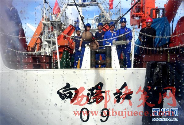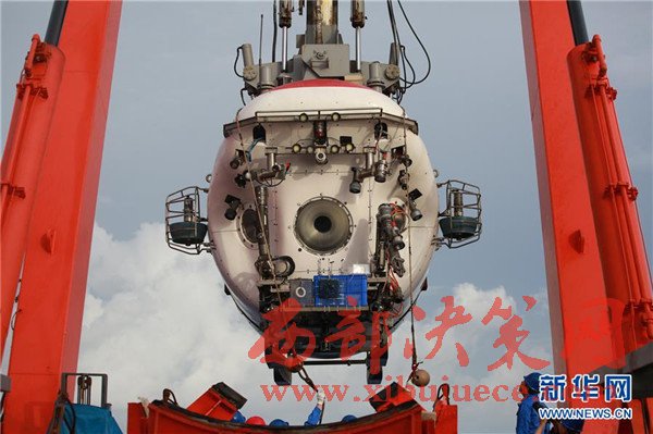 5月23日,“蛟龍”號完成下潛后回收到“向陽紅09”科學考察船上。